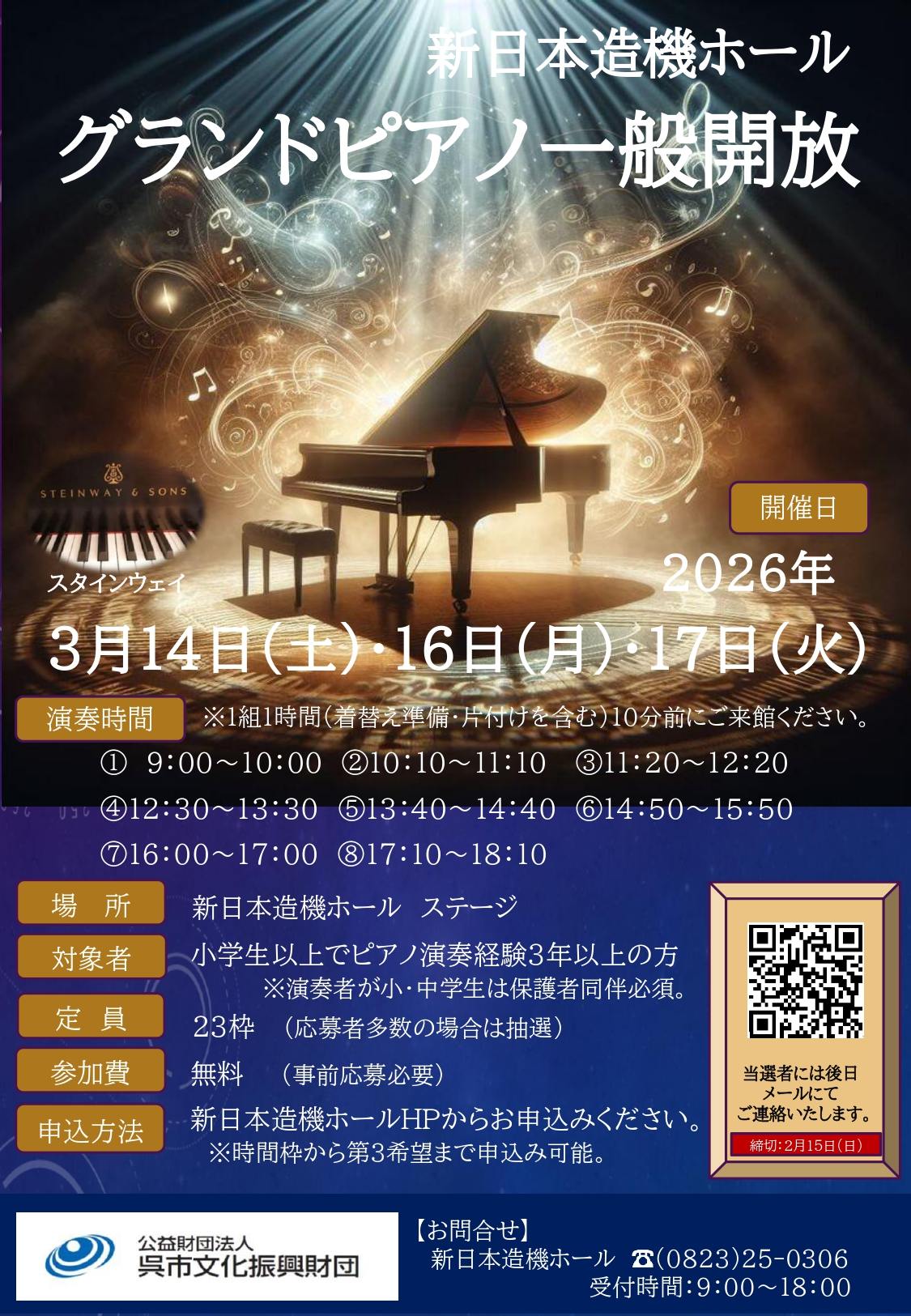 新日本造機ホール所有のスタインウェイを無料で一般開放することで、ステージで直接ふれていただく機会を提供するとともに、新日本造機ホールに慣れ親しんでいただくため『グランドピアノ一般開放』を開催いたします。ぜひご応募ください。